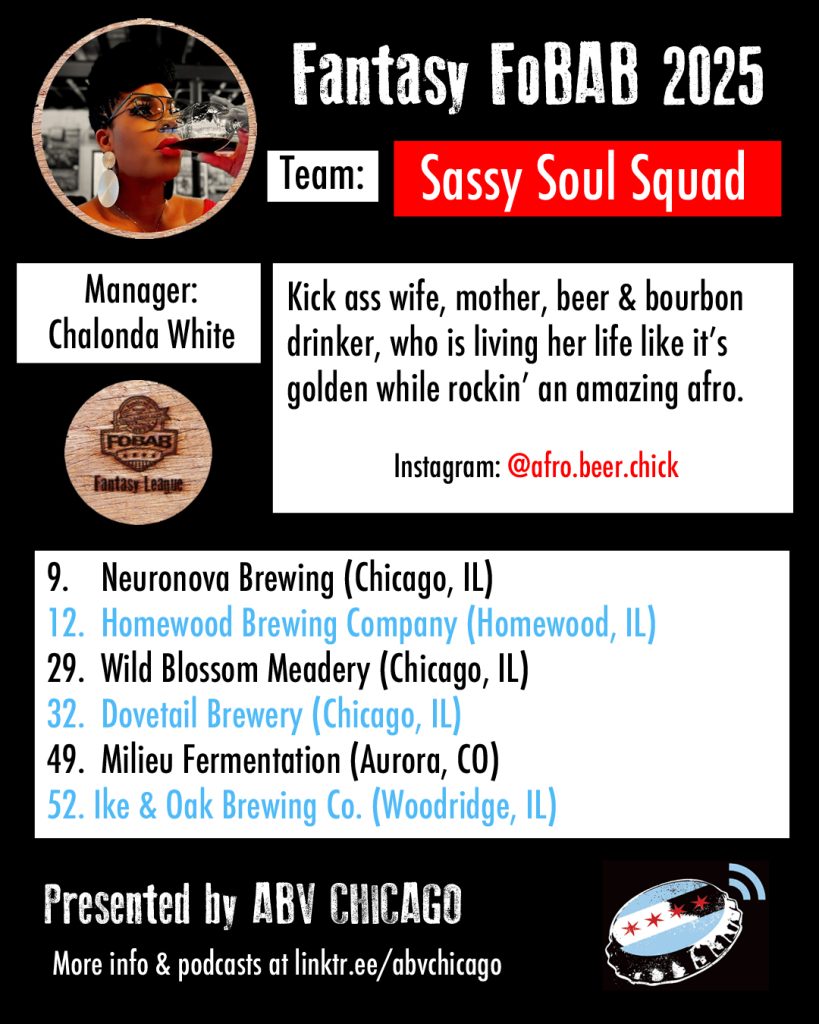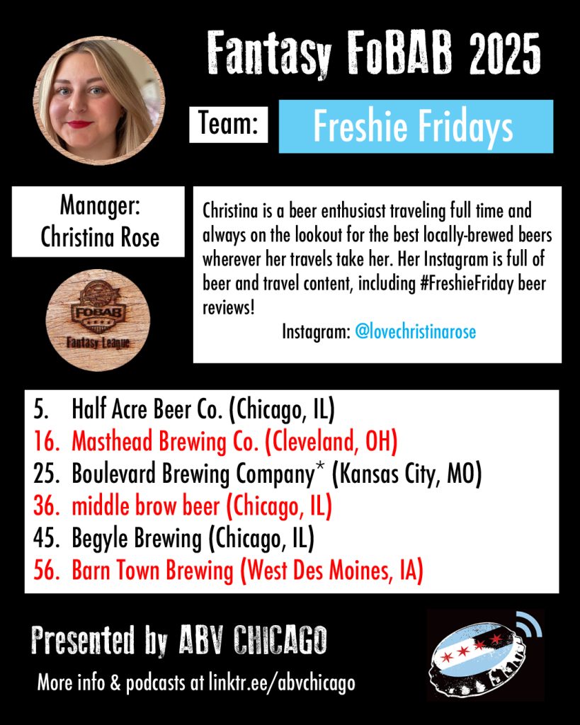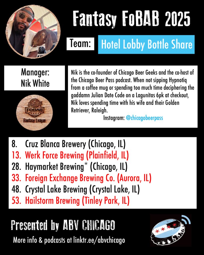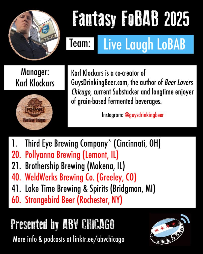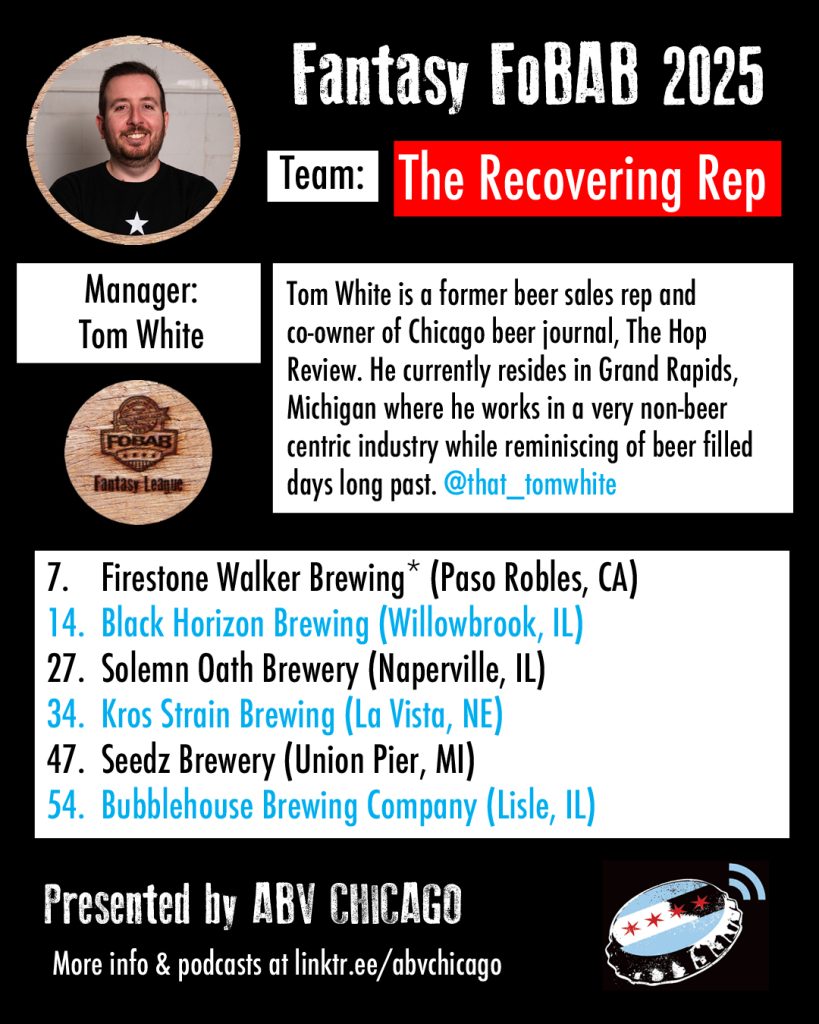 The League: Seven years back, we made a list of Chicago beer media members and personalities that we’d like to have in our league, and we were delighted when every single person we contacted was enthusiastically on board. When we reached out this year to re-invite last year’s managers, everyone opted back in. We admire the work of all the team managers and what they do or have done for beer, and we suggest you give them all a follow, patronize their businesses, or just give them a hearty cheers when you see them.