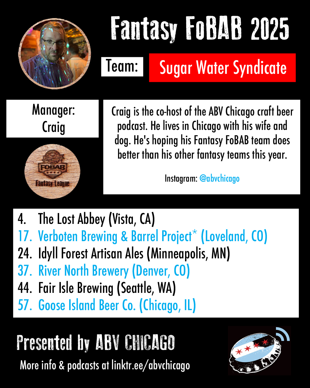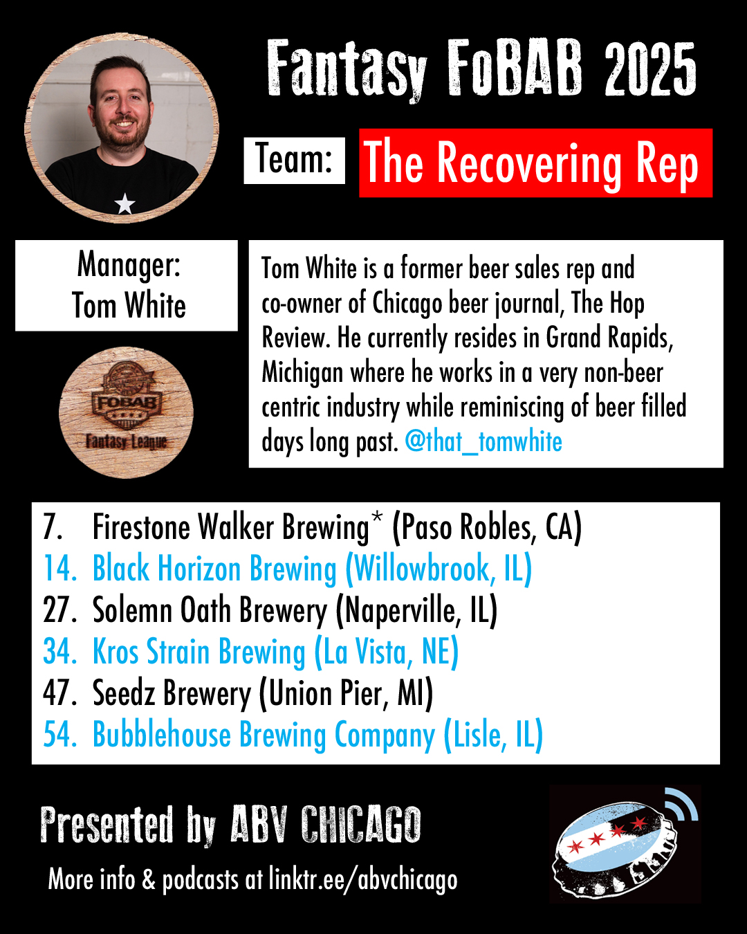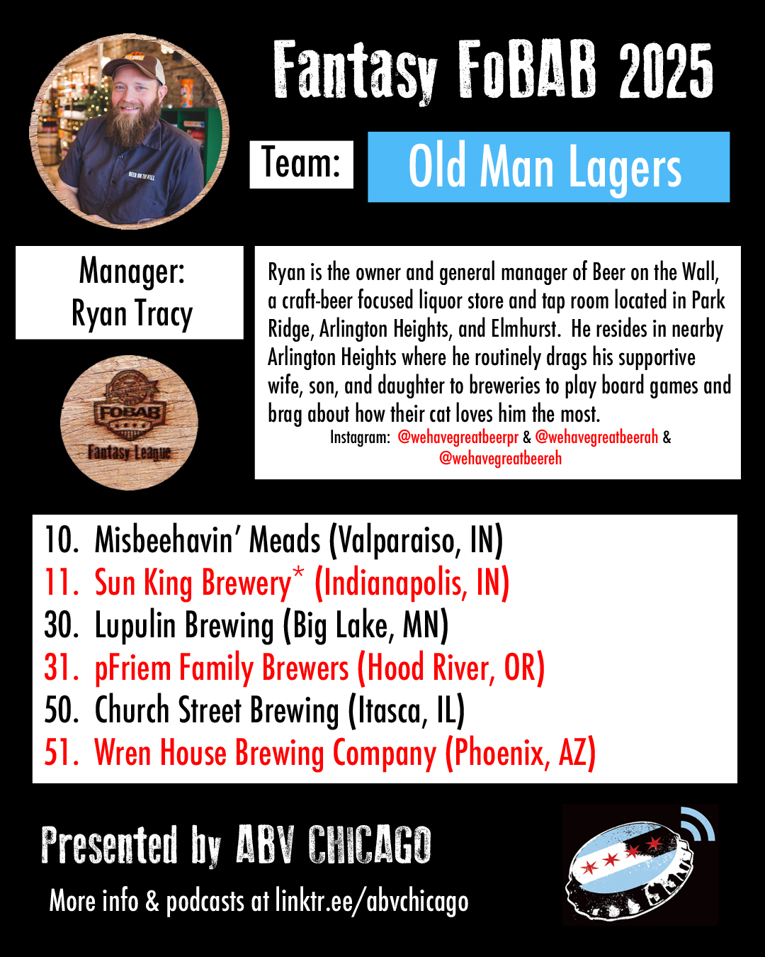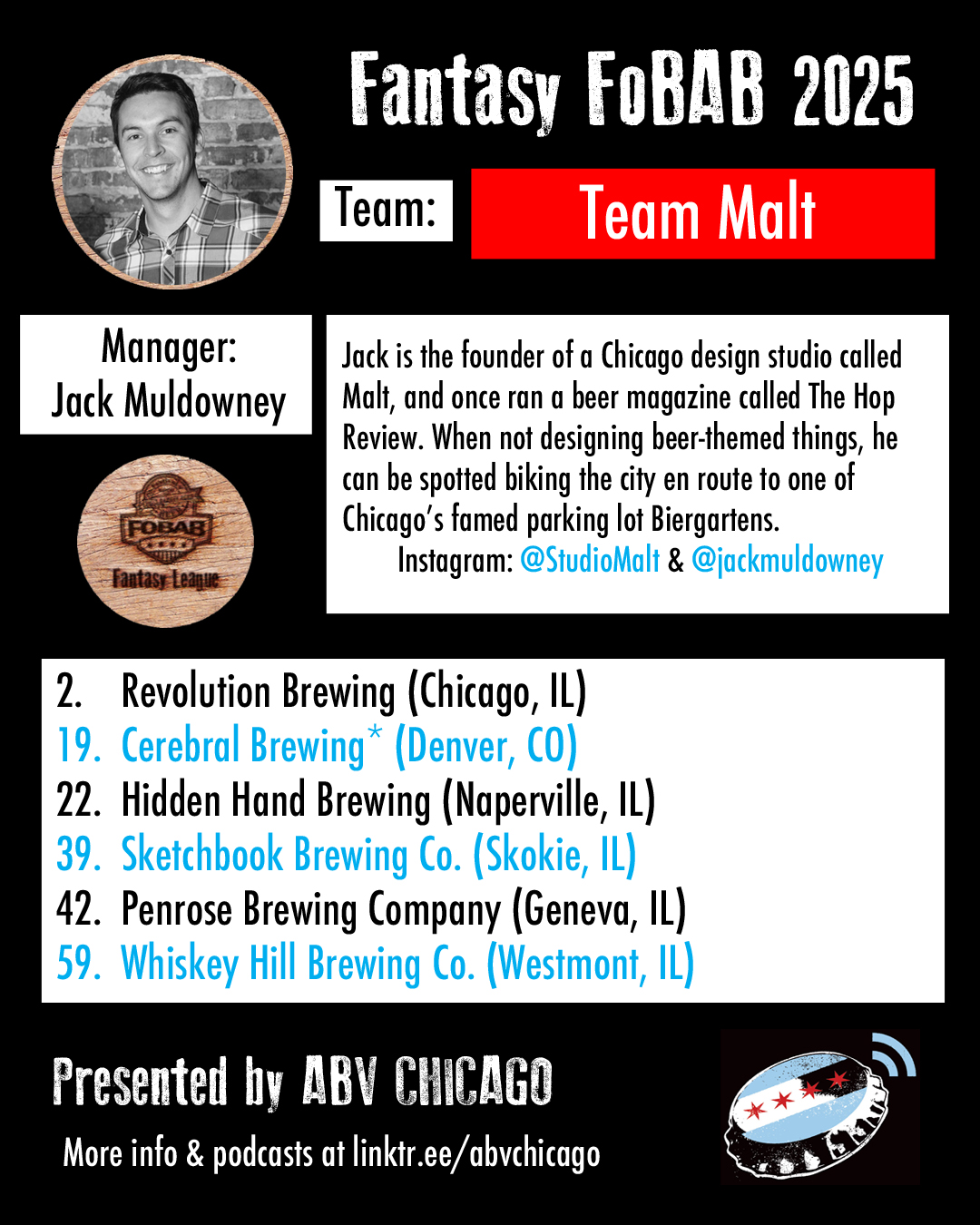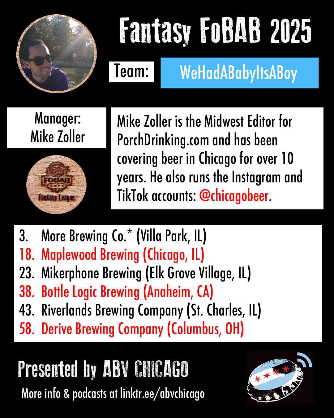 The League: Seven years back, we made a list of Chicago beer media members and personalities that we’d like to have in our league, and we were delighted when every single person we contacted was enthusiastically on board. When we reached out this year to re-invite last year’s managers, everyone opted back in. We admire the work of all the team managers and what they do or have done for beer, and we suggest you give them all a follow, patronize their businesses, or just give them a hearty cheers when you see them.